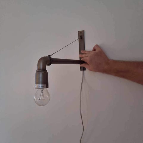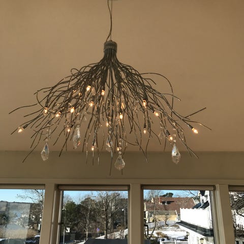 Sladden är repklädd ca 4 meter. Har av/på knapp. Tyvärr behåller jag glödlampan då jag lånade den från en annan lampa här hemma.