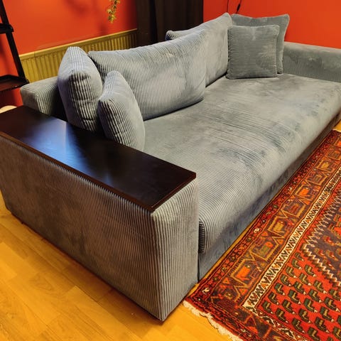 Mörkblå i sammet, behöver dock en enklare möbeltvätt då den stått på vårat kontor. Förövrigt i bra skick. Har stått i Djur och rökfri miljö.