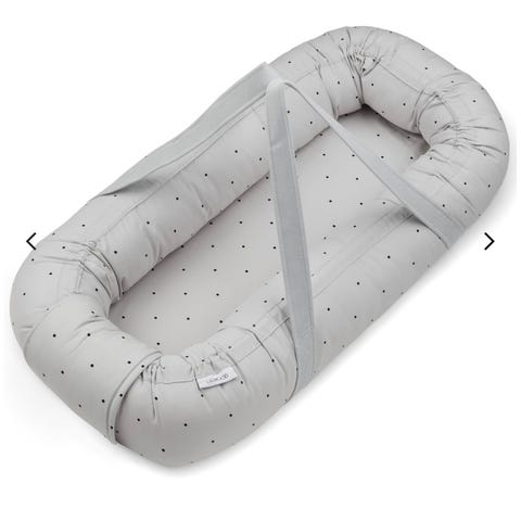Babynest med handtag i grå tyg med små prickar. Mjuk, vadderad kant runtom ger en ombonad sovplats för spädbarn. Utrustad med två bärhandtag för enkel förflyttning inom hemmet samt hård botten .