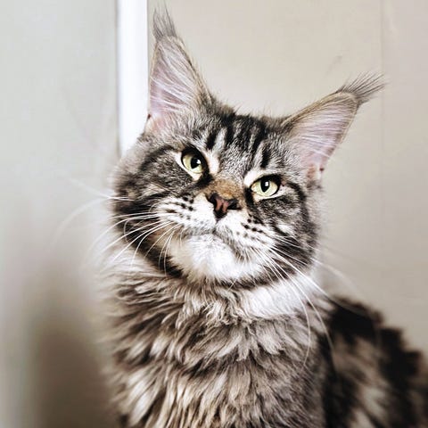 Maine coon hane i svartsmoke, lång och tät päls. Han har gröna ögon och kraftig kroppsbyggnad, typisk för rasen. Han är en riktig följeslagare och nyfiken på allt vi hittar på.