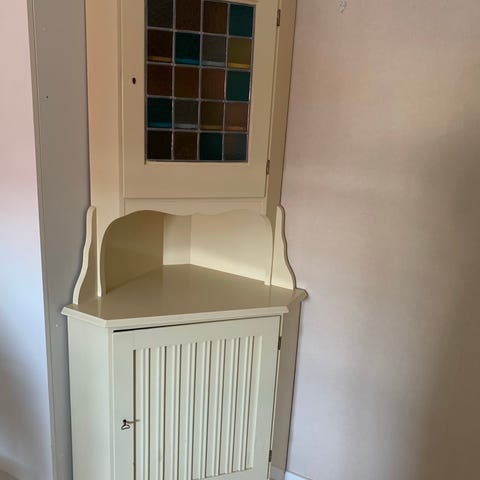 Säljer två hörnskåp, ena står på golvet, andra är upphängt på väggen.