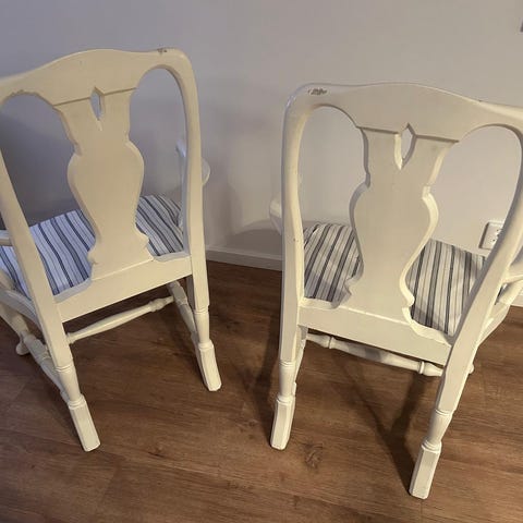 Stolarna passar perfekt i en matsal, ett vardagsrum eller som ett stilfullt inslag i en mer traditionell miljö. Normalt bruksslitage i förhållande till ålder, men överlag i gott skick.