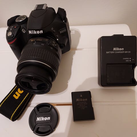 Nikon systemkamera med svart kamerahus och zoomobjektiv. Kameran har vridbar skärm på baksidan och rem med Nikon-logotyp. På bilderna syns även batteriladdare, motljusskydd och en kameraväska. Systemkameran passar för allmän fotografering, till exempel resor, vardagsbilder och enklare hobbyfoto, med möjlighet att byta objektiv efter behov.