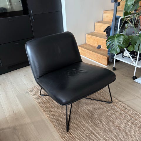 Fåtöljerna har sits i kraftigt läder med dekorativa handsömmar och stadigt underrede i svartlackerad metall.