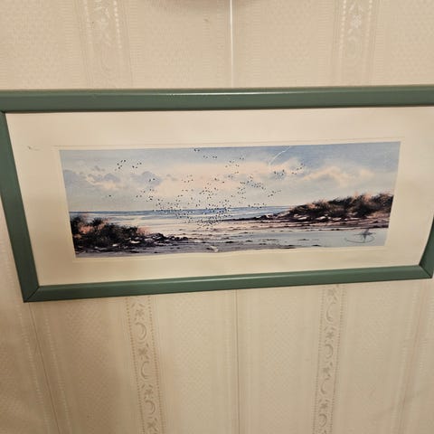 Bilden går i blå toner och är monterad i en ljus passepartout. Tavlan är inramad i en enkel träram och har upphängningssnöre på baksidan. Passar som väggdekoration i exempelvis vardagsrum, hall eller arbetsrum.
