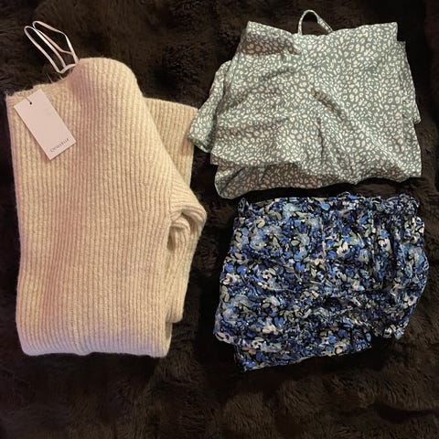 1 st Kort blommig kjol, dragkedja i sida, med underkjol.