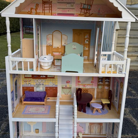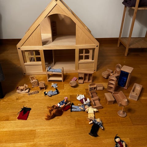 Till dockskåpet följer olika möbler om önskas .. de är välanvända och någon är lite trasig. Men finns toalett, garderob, sminkbord, kök(trasigt), spegel och typ byrå.