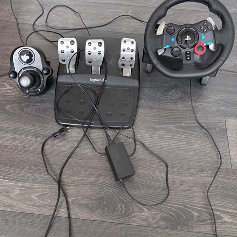 Logitech G920 racerratt för Xbox One med tillhörande pedaler och manuell växelspak. Ratten har inbyggda Xbox-knappar, gummiklädd rattkrans och monteringsfästen för bord eller stativ.