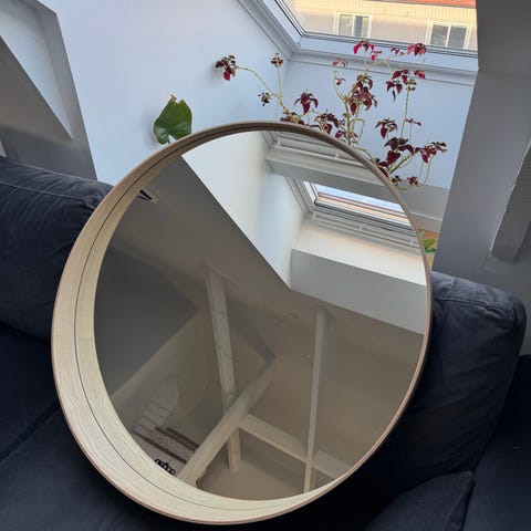 Speglar i lackat stål, vit respektive mörkt vinröd. Från Ikeas och Hay's samarbete 2017.