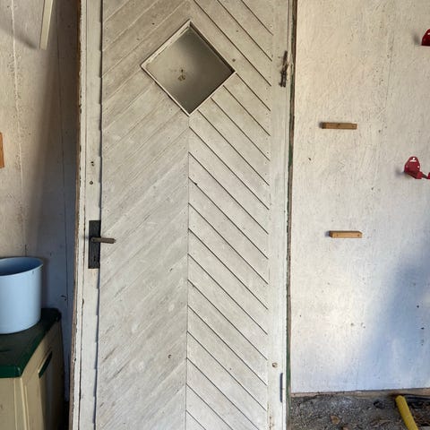 Ytterdörr i trä i klassisk spegelindelad modell. En dörr är vitmålad och en är grönmålad. Dörrarna har urtag för lås och handtag. Passar som ytterdörr eller förrådsdörr i bostad, fritidshus eller komplementbyggnad.