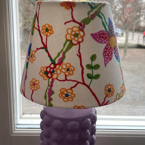 Bordslampa med vit lampfot i keramik och textilskärm med flerfärgat blommönster. Passar som belysning på fönsterbräda, sängbord eller sidobord. Lampan använder standard glödlampa eller LED-lampa med vanlig sockel.