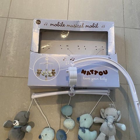 Nattlampa formad som en grå mus med strömkabel. Produkten är avsedd för spädbarn och små barn som visuell och ljudmässig stimulans vid vila och läggdags.