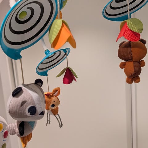 Jollyroom babymobil med musik. Mobilen har en rund hållare med hängande mjuka figurer och en enhet med knappar för olika melodier och ljud. Den monteras med arm och fäste, lämplig att sätta på spjälsäng eller liknande.