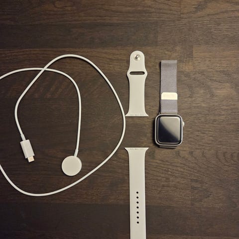 Säljer min fina Apple Watch 5 med 40 mm silverboett och vit sportrem. Klockan levereras med magnetisk laddkabel och originalförpackning enligt bild. Använd tillsammans med iPhone för notifieringar, aktivitetsmätning och andra smartklockfunktioner för att underlätta vardagen och öka motionen.