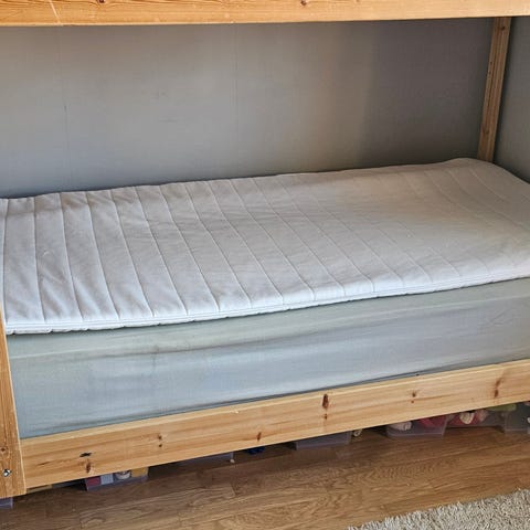 Använd av ett 6-årigt barn och därmed i mycket fint skick. Ingen fördjupning i madrassen. På sista bilden syns en fläck på utsidan av madrassen. Den har tillkommit vid flytt och är inte behandlad.