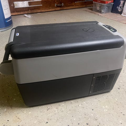 AEG kylskåp i portabel modell. Kylbox med lock upptill och invändig förvaringslåda. Utrustad med handtag och hjul för enklare förflyttning. Passar för kylförvaring av mat och dryck, exempelvis vid resor, camping eller tillfällig förvaring. Strömkabel medföljer enligt bild.