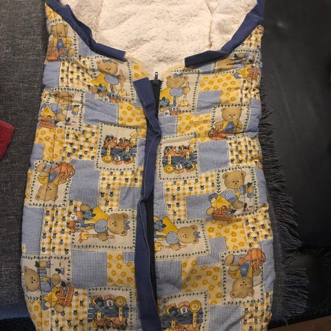 Varm och gosig åkpåse i mörkblått med en fluffig fuskpälskrage som är avtagbar.