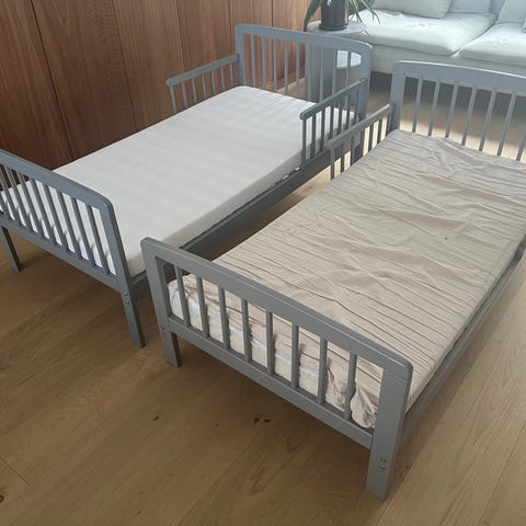 Lite avskav på några ställen. Madrass (70x140) med madrasskydd och två lakan ingår. Hämtas i Sköndal.