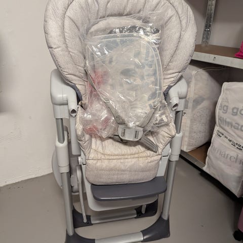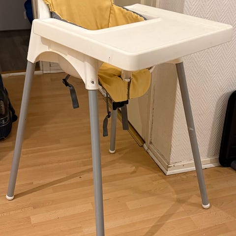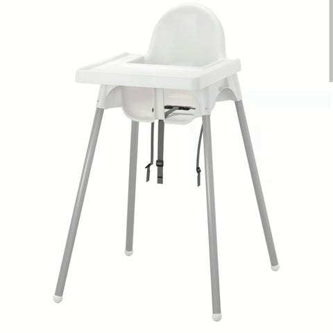 IKEA barnmatstol - Antilop med bricka i vit plast och ben i metall. Stolen har säkerhetsbälten och en avtagbar matbricka med upphöjd kant. Passar för små barn som kan sitta själva vid matbordet. Enkel konstruktion som är lätt att torka av och hålla ren.