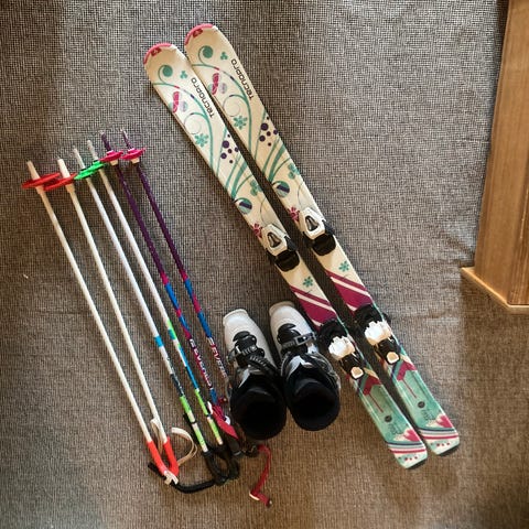 På ena skidan syns en mindre skada i belaget/toppbelaget enligt bild. Skidorna lämpar sig för barn eller ungdomar som åker alpint i backe.