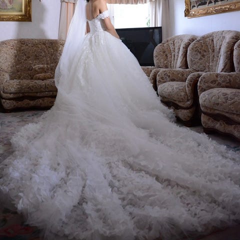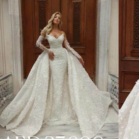 En otroligt vacker nude klänning med spetsdetaljer, elegant släp och fantastisk rygg.