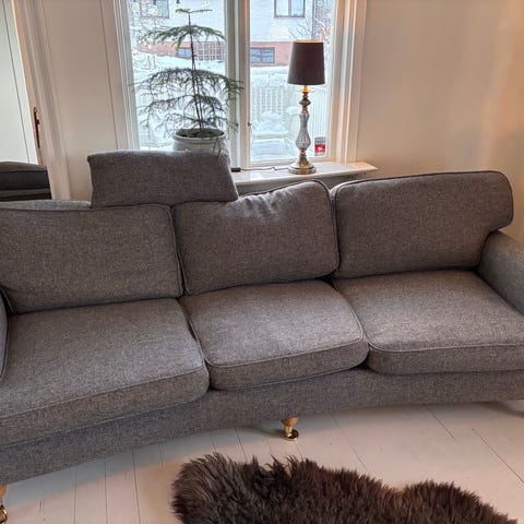 Svängd 3-sitsig Howardsoffa från Mio i väldigt fint skick. Finns hund i hemmet men soffan har alltid haft filt över sig. Grå-blå.