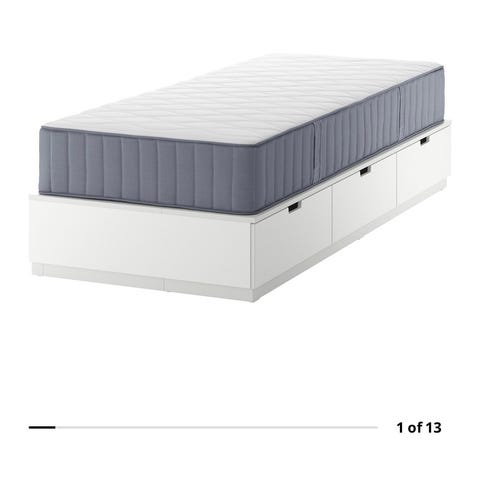 IKEA enkelsäng i vit färg 90 x 200 cm. Sängen har en enkel, rak design med huvud- och fotgavel samt ribbotten i trä. Under sängen finns 3 utdragbara lådor på hjul som ger extra förvaringsutrymme för till exempel leksaker, kläder eller sängkläder. Passar som barnsäng eller juniorsäng i barnrum eller gästrum.