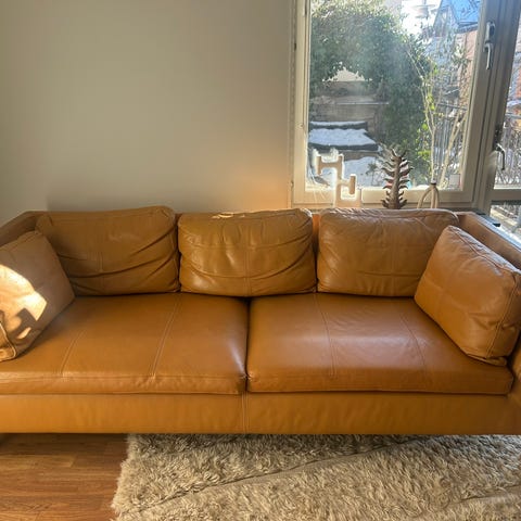 Säljer en rak 3-sits Lord skinnsoffa från BD Möbler, inköpt hos Nilssons Möbler i Svedala. Stilren modell med djuphäftad rygg, skön sittkomfort och ben i metall (borstat stål-look). Skinn i varm cognac/kamelton som får fin patina.