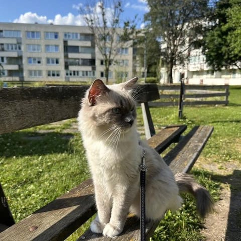 Vi är relativt nyinflyttade till Västervik. Tyvärr trivs vi inte där vi bor och jag har inte lyckats hitta något bättre ställe ännu. Isidor saknar skogspromenader och att få klättra i träd. Han är mycket van att gå långt i sele och koppel. Häromkring finns mest gator och och lite natur. Isidor blir även stressad över alla lösa katter som stryker omkring här. Han är ej lös ute och kommer inte få bli det.