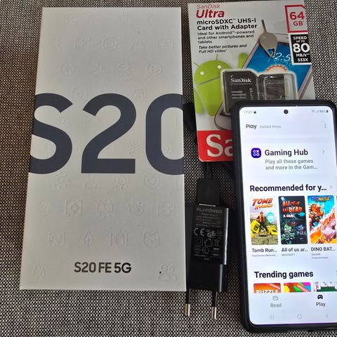 Samsung Galaxy S20 smartphone med 128 GB intern lagring. Telefonen har en ljusblå baksida och pekskärm på framsidan. Inga sprickor eller repor, haft skärmskydd och fodral. Senast använt för drygt ett år sedan, har legat oanvänd. En ägare. En laddkabel medföljer. Ingen kartong.
