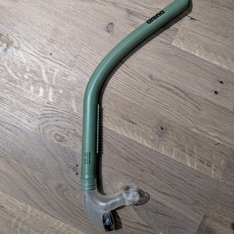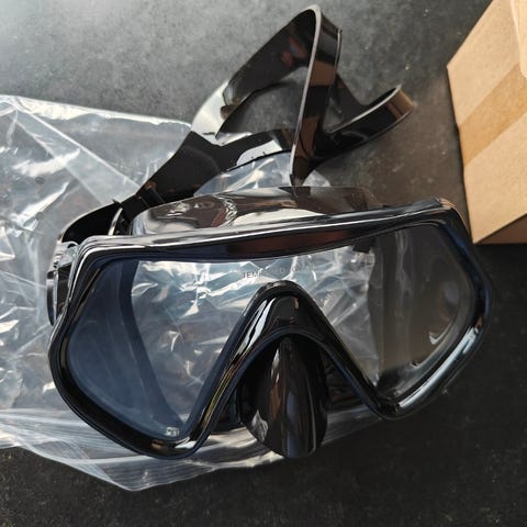 Snorkelmask helmask i svart färg med genomskinlig front. Masken täcker hela ansiktet och har inbyggd snorkel upptill. Justerbara elastiska remmar på baksidan för att passa olika huvudstorlekar. Avsedd för snorkling och ytsimning i vatten. Den har använts men sedan så slutade jag använda den