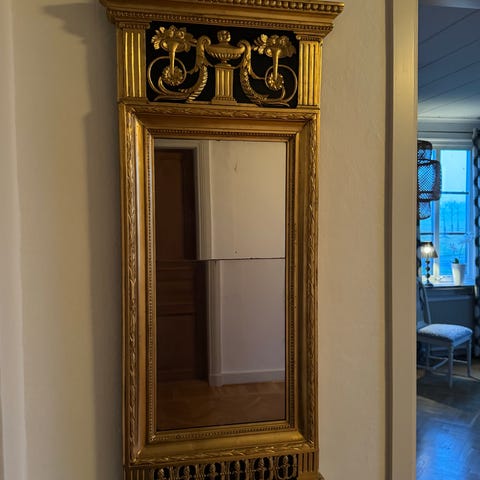 Väggspegel med rektangulär form och profilerad ram i guldfärgad metall eller metallimiterande material. Spegeln har fasettslipade speglar runt en central spegel samt en dekorativ överdel med reliefmotiv av blad och frukter. Passar som inredningsdetalj i exempelvis hall, vardagsrum eller sovrum och kan hängas på vägg.