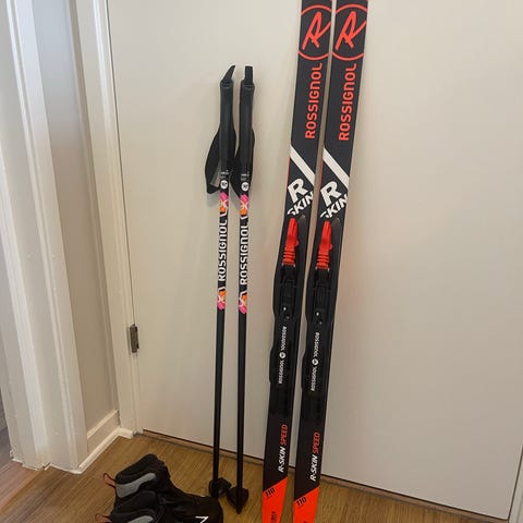 Säljer dotterns vallningsfria (fiskfjäll) längdskidor av märket Atomic Ski Tiger som är 130 cm långa med tillhörande 100 cm långa stavar (Diamond 600). Bindningen har SNS-profil och passande Salomonpjäxor i storlek 33 finns.