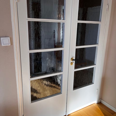 Vitrin med med vit ram och glas med mönstrad yta. Flera hyllplan