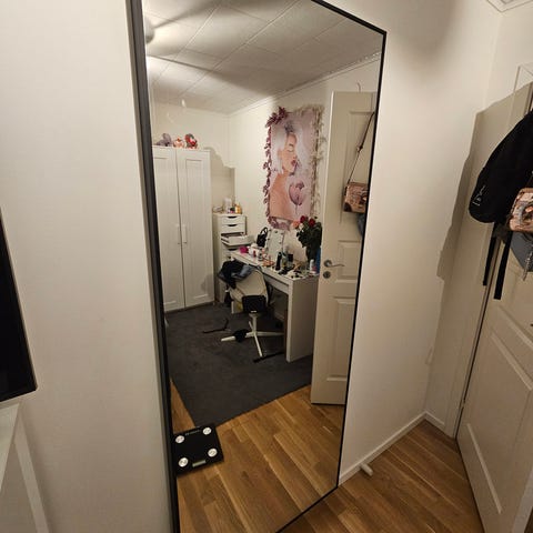 Rund spegel med svart ram. Passar exempelvis i hall, vardagsrum eller sovrum. Enkel, modern design som fungerar både som praktisk spegel och som inredningsdetalj på vägg eller lutad mot golv. Mått: 85 cm