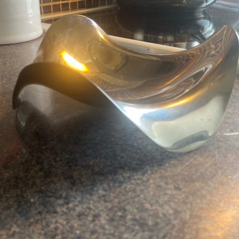 Georg Jensen skål i blankt rostfritt stål. Skålen har en organisk, avlång form med lätt upphöjda kanter. Passar som frukt- eller serveringsskål samt som dekorationsföremål i kök eller vardagsrum.