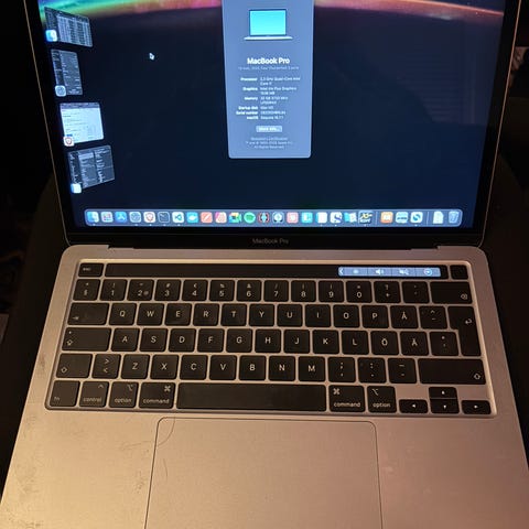 Apple MacBook Pro laptop med 13-tums skärm i grå färg. Datorn har bakbelyst tangentbord, styrplatta och Touch Bar ovanför tangentraden. Höljet är i metall och färgen är mörkgrå (space gray).