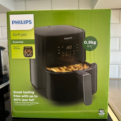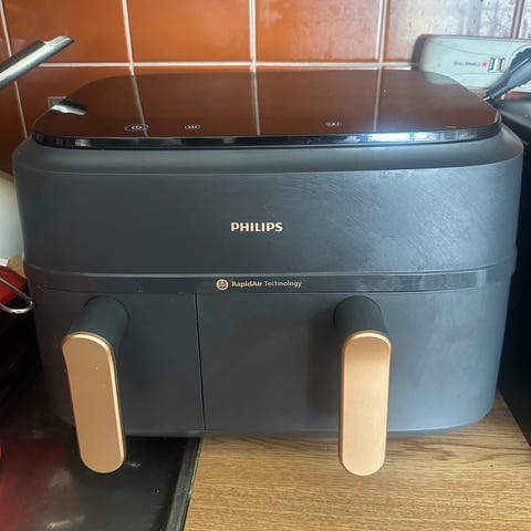 En airfryer med 2 fack, går att köra båda eller ena, man väljer tid och temperatur för vardera fack.