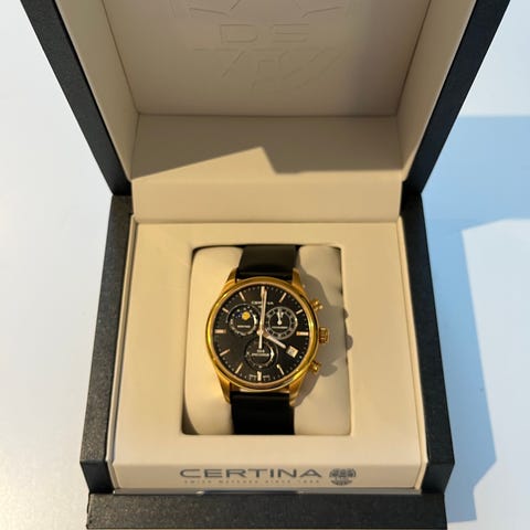 Certina herrklocka med kronograf och datumvisning. Klockan har svart urtavla med tre subdials och tydliga indexmarkeringar. Boett och länk är i rostfritt stål med viklås. Modellen är automatisk och levereras med originalask enligt bild. Passar för herrar som vill ha en analog armbandsklocka i stål med kronograf och datumfunktion.