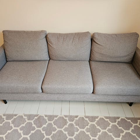 1.70 lång. Super skön och rejäl. Kuddarna går att tvätta. Säljs dock otvättad. Perfekt storlek för mindre rum lr lägenhet. Jag har älskat denna soffan! Finns på gamla väster i Malmö. Ta med bärhjälp. Hiss finns.