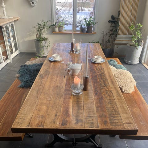 Säljer ett fantastiskt matbord i massiv, återvunnen alm från Sweef. Bordet är inköpt för några år sedan men har knappt använts, så det är i mycket gott skick. Det är en rejäl och stabil möbel, vintage känsla.