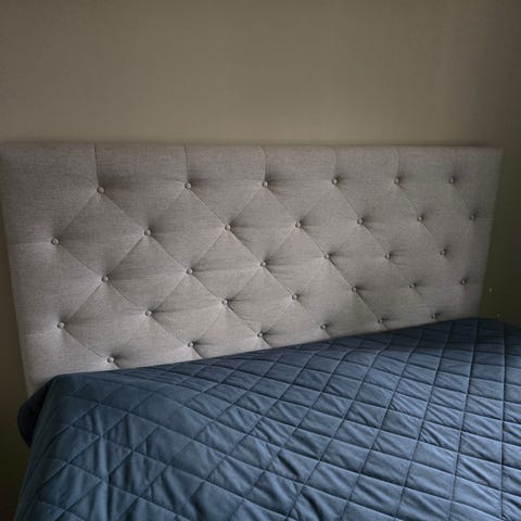 Mio sänggavel i grått tyg med knapptuftad, vadderad framsida. Gaveln är avsedd att placeras bakom en säng och ger stöd för rygg och kuddar. Passar som komplement till sängram eller kontinentalsäng där en fristående sänggavel önskas. Exakta mått och sängbredd anges vid behov av säljaren.