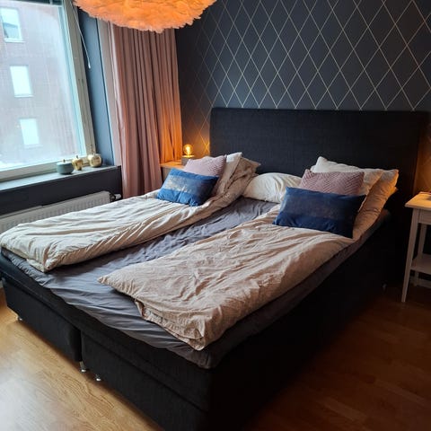 IKEA säng med sänggavel i grått tyg.