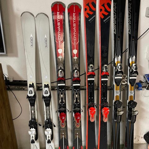 Dynastar Team Omeglass slalomskidor med bindningar. Skidorna är 120 cm långa och har midjemått 64 mm enligt märkning på skidan. Färgkombination i vitt, rött, gult och svart.