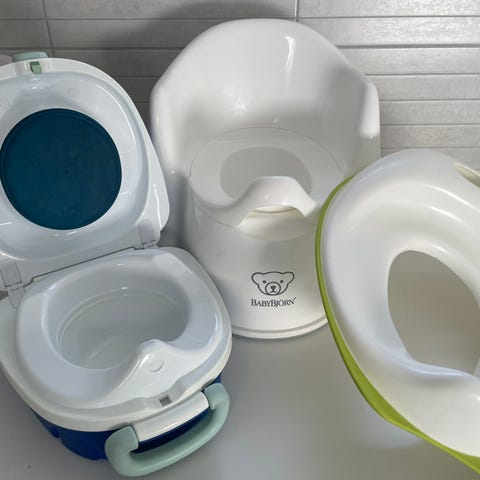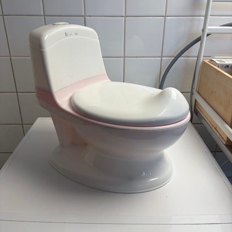 IKEA potta och toasits i vit och grön plast. Setet består av en potta och en lös toasits som kan placeras på en vanlig toalettstol. Utformat för små barn vid potträning. Lätt att rengöra tack vare släta ytor och avtagbara delar. Passar för inomhusbruk i badrum.