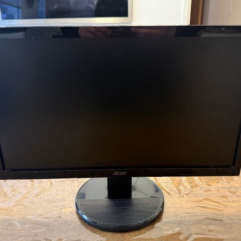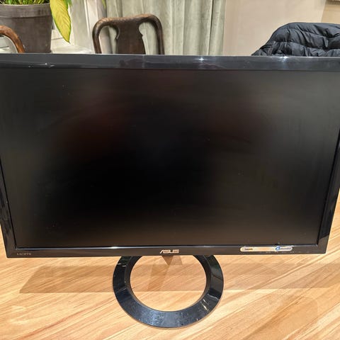 Asus VG248QE bildskärm med 24 tum skärmstorlek i svart utförande. Skärmen är avsedd för stationär datoranvändning och gaming men fungerar väl för vardagligt bruk. Modellen har anslutningar enligt märkningen på baksidan (till exempel HDMI/DVI/VGA beroende på version) och står på en rund fot. Strömanslutning och bildkabel ansluts på baksidan av skärmen.