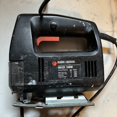 Bosch GST 85 PE sticksåg med nätkabel. Effekten är 580 W och den drivs med 230 V, 50 Hz. Sågen är avsedd för sågning i trä och andra material enligt tillverkarens rekommendationer. Utrustad med justerbar sågfot och handtag för styrning vid kapning och figursågning. Färg blå med metallhus runt sågfoten. Tillverkad av Scintilla SA i Schweiz enligt märkplåt på maskinen.