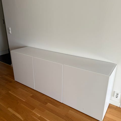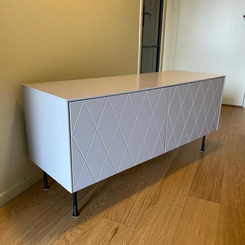Fin sideboard med luckor, sidor, topp samt ben från Superfront. Färgen är behagligt ljus grönaktig. Beslag samt ben i mässing. Stomme (Bestå) från IKEA. Är i ett generellt bra skick. Hämtas på plats.