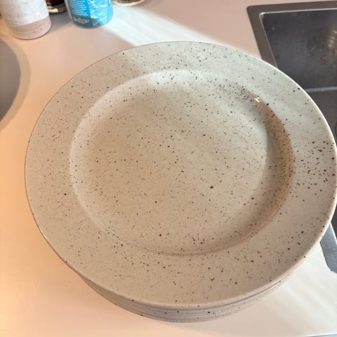 Säljer ett set med stilrena tallrikar i stengods med vacker, spräcklig glasyr i mjuka färger.