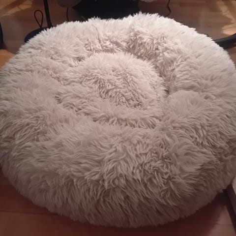Cylinderformad katt- eller smådjursmöbel med öppning i sidan. Utsidan är klädd i beige/grått material med struktur och insidan samt ovansidan är täckt av vitt, mjukt tyg. Möbeln kan användas som krypin, sovplats eller gömställe för katt eller mindre husdjur. Passar att placeras på golv eller i inhägnad miljö för smådjur.